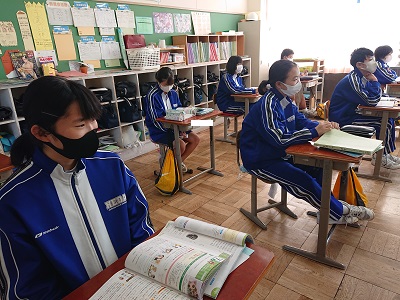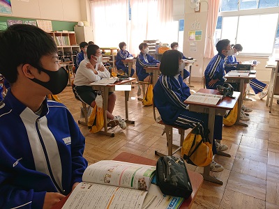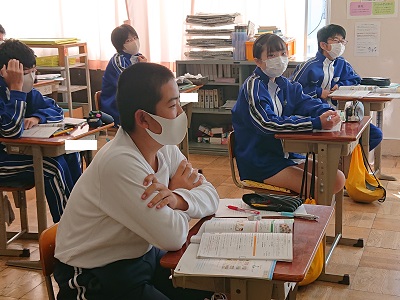 2年生は英語でPROGRAM7を学習しています。「(人)に(ものを)〜する」という言い方を学習し、実際に英語で話してみました。