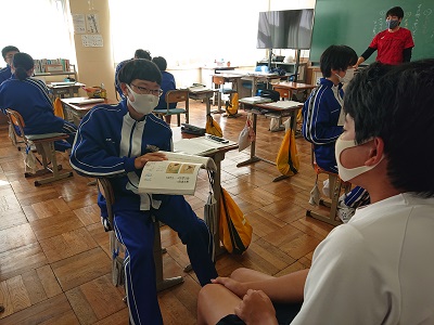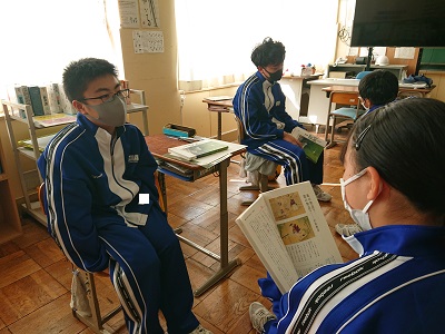 1年生は国語で古典を学習しています。「竹取物語」の学習では、「内容を理解して音読し、古文特有のリズムを味わうこと」を目標に、ペア活動で本文を読み合いました。
