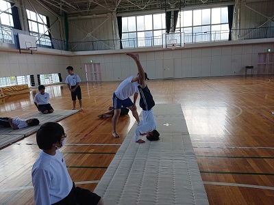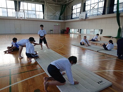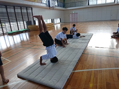 1年生は体育でマット運動を行っています。今日は、頭倒立(三点倒立)にチャレンジしました。