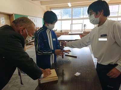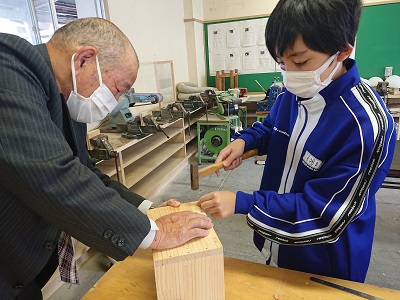 1年生は技術で「材料と加工に関する技術」という単元を学習しています。これまで学習を進めている生徒は積極的にきりで穴を開けたり、げんのうを使って接合を行ったりしました。休み時間には、児童生徒支援員さんも一緒に活動に参加しています。