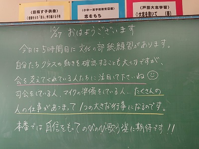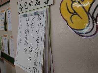 各クラスには、学級担任が思いを込めて用意した「黒板メッセージや今日の名言」が掲げられています。朝早くから学級担任が準備しています。