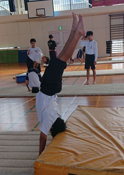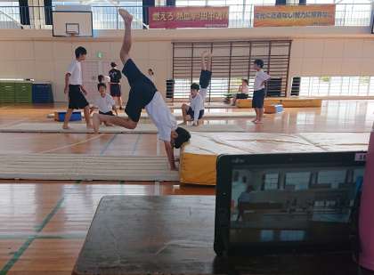 1年生は体育でマット運動を行っていました。タブレットで運動動作を撮影しながら自己チェックしているグループもいます。
