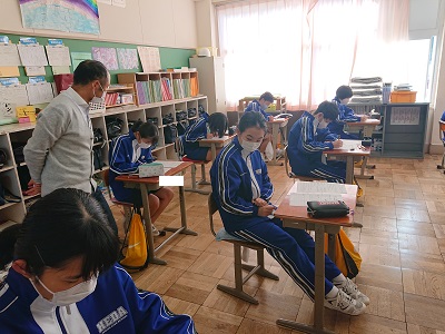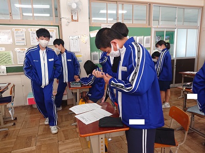 2年生は道徳で「沖縄戦について知ろう −「HEIWAの鐘」はどんな気持ちで?−」ということをテーマに、沖縄のことについて友達と情報共有した後、クラス合唱曲の「HEIWAの鐘」をどのような歌にしていくかを話し合いました。