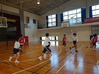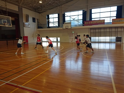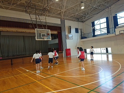2年生は体育でバスケットボールを行っています。ゲーム形式で活動し、チームの作戦を確認しました。