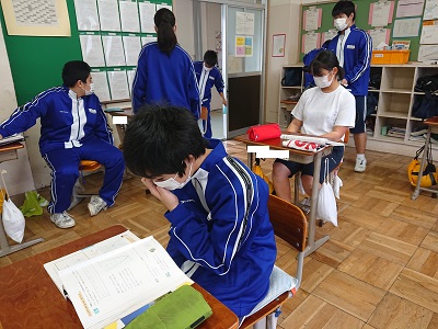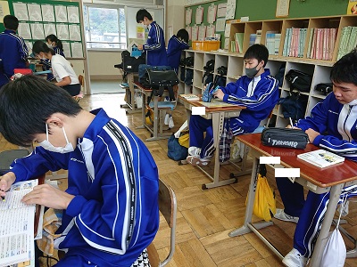 3年生は朝の支度ができた生徒から朝学習に入りました。明日の期末テストに向けて対策は万全です。