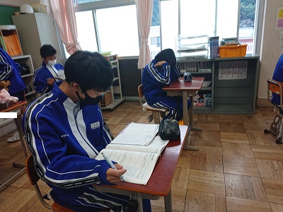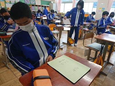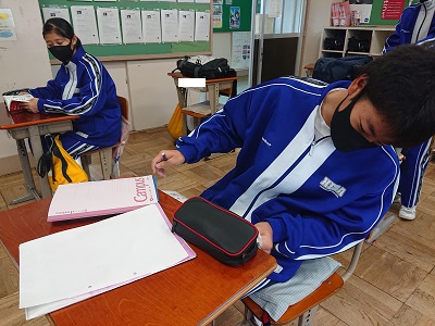 2年生は朝の支度ができた生徒から朝学習に入りました。明日の期末テストに向けて、自主学習を行っています。