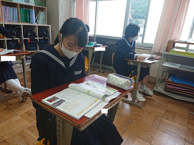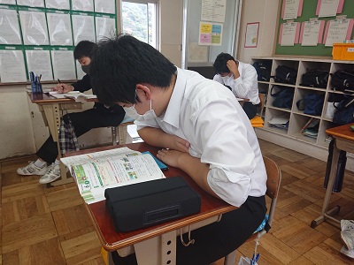 本日は期末テストです。3年生は朝学習の時間に、みんな集中して勉強していました。3年生は高校入試のプレテストとして、制服でテストを受けます。