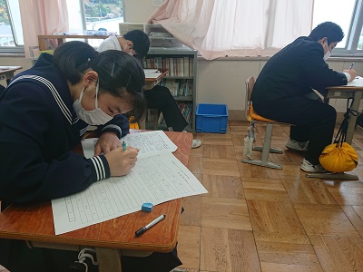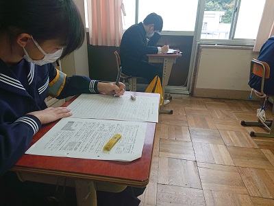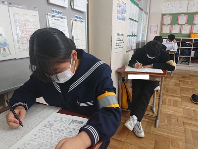 3年生は社会のテストに取り組んでいます。みんな集中しています。