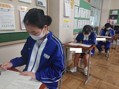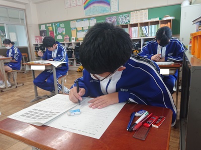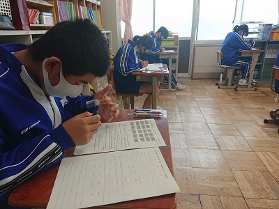 2年生は英語のテストに取り組んでいます。みんな集中しています。