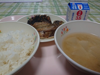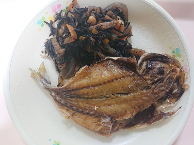 今日の給食に、鰺の干物が登場しました。干物は素揚げしてあるので、骨までバリバリ食べることができ、自分の骨づくりになります。みんなで美味しくいただきました。