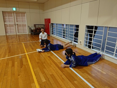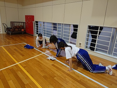 女子ソフトテニス部の様子です。最初は読書部?かと思いましたが、いえいえ違いました。筋トレの本からトレーニングメニューを考え、それを実践していました。
