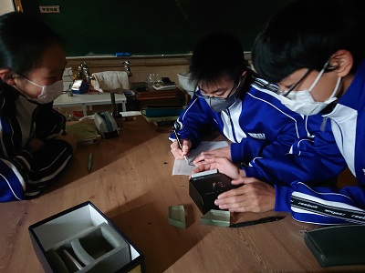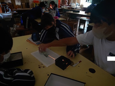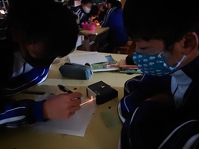 1年生は理科で「身近な物理現象」という単元を学習しています。今日は、光源装置を使って、光の道筋を調べる実験を行っていました。