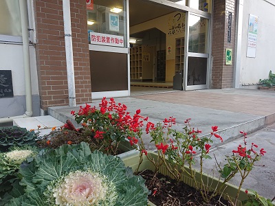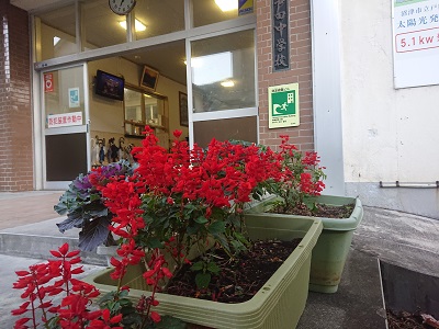 玄関の様子です。玄関前には「戸田花の会」の皆様からいただいた花々がきれいに咲いています。
