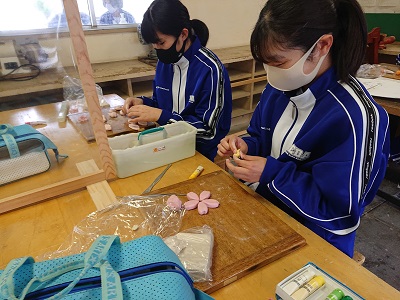 2年生は美術で「日本の美意識」という教材を学習しています。教科書や資料集を読みながら、日本の工芸品に生かされている自然の美しさや季節の彩りについて感じ取ったことを粘土細工で表現していました。
