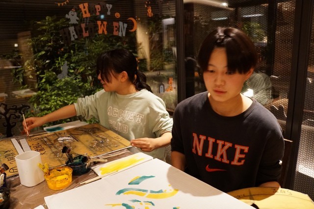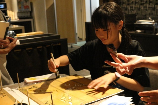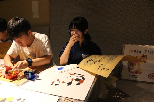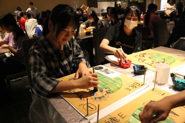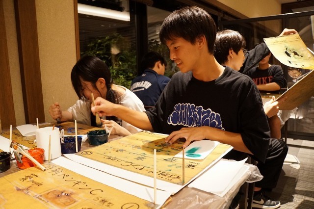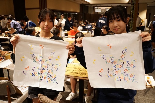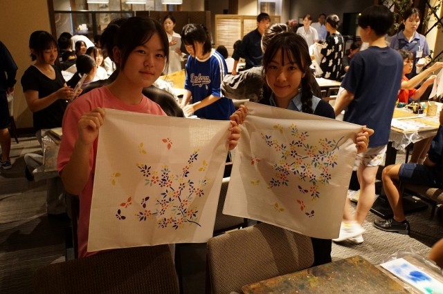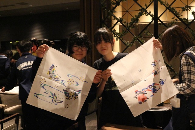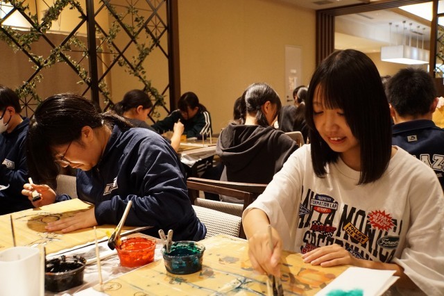 10月15日(木)2日目の夜は、ホテルで友禅染の体験を行いました。どの生徒も真剣に作業を進めていました。