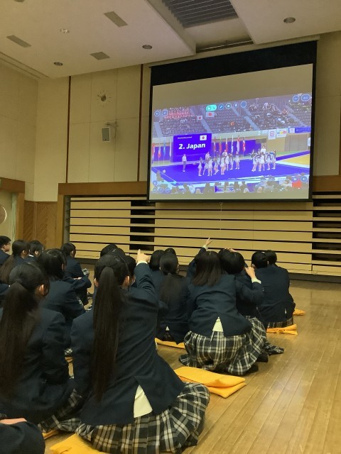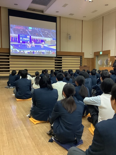 最初に、チアリーディング世界大会の優勝報告会を行いました。