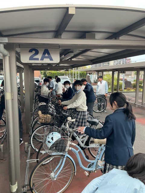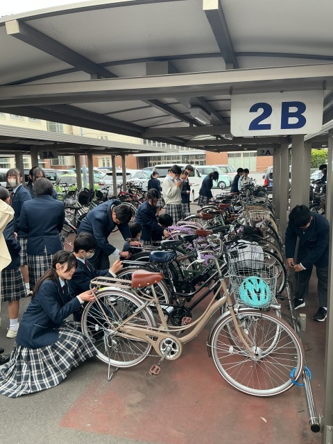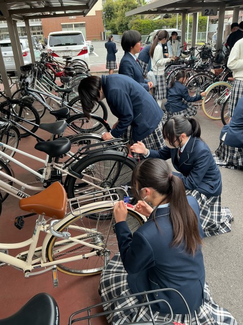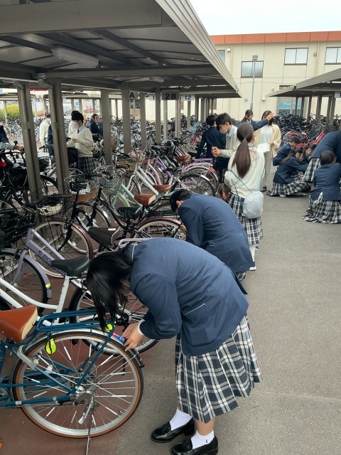 4月13日(月)本日は自転車点検でした。2・3年生が点検を受けて、新しいステッカー貼っていました。