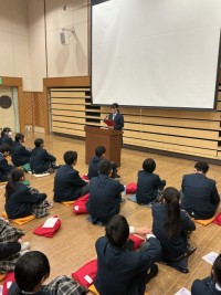 校長先生からは、幼虫や蝶の写真からその成長にからめて、中学生とは幼虫であり、たくさん葉っぱを食べて成長する時期であること、青虫は気持ち悪いと思われがちだが、美しい蝶になる。先入観で見てしまっているものを見直すことの大切さ、などについてお話ししていただきました。ポケモンの進化に例えた時の皆さんの反応が印象的です。