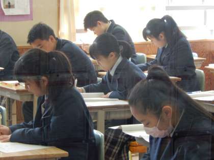 3年生は全国学力学習状況調査を実施中。真剣な表情で取り組んでいます。1年生はふれあい学習として、午前中、近所の東芝体育館をお借りして学年の活動を行っています。
