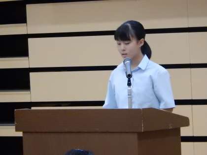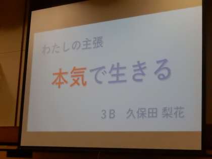 先週金曜日、「わたしの主張大会」に出場する久保田さんが、大会を前に全校に向け発表を行いました。