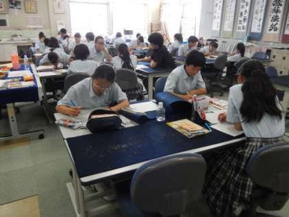 1年生の国語表現です。自分の気に入った文章の清書を行っていました。作品の仕上がりが楽しみです。