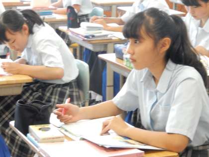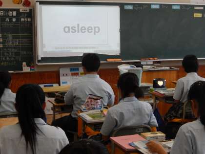 3年生の英語です。単語の発音練習の後、リスニング、ライティングの活動が始まりました。