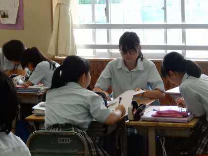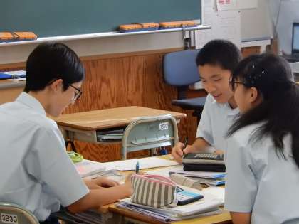 3年生の数学です。ルートのつく計算がどんどん難しくなってきました。グループで問題を解いています。