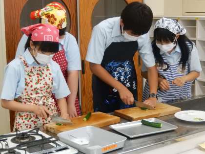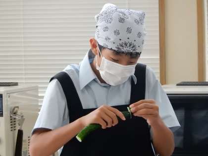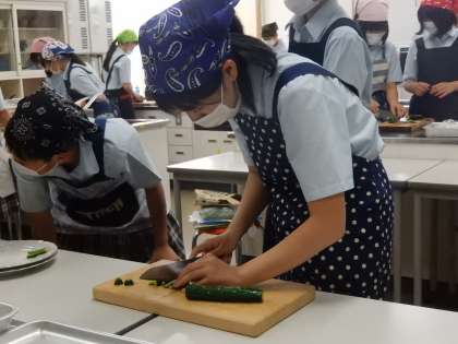 2Bの家庭です。調理実習です。キュウリを切る包丁さばきが…。みんな真剣です。