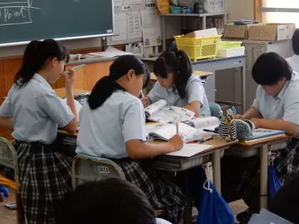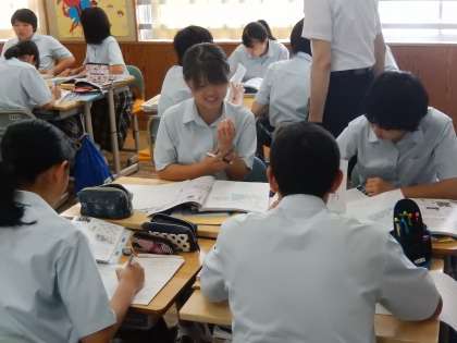 3年生の社会です。「なぜ日本はアメリカとの戦争に踏み切らないといけなかったか」のテーマで、グループごとまとめをしていました。熱心に話し合うグループが目立ちました。