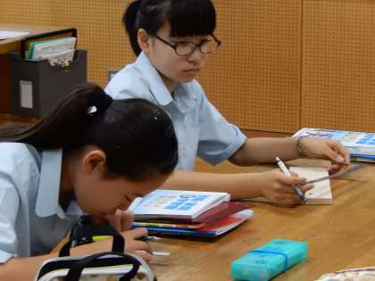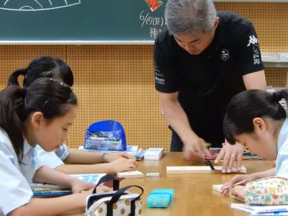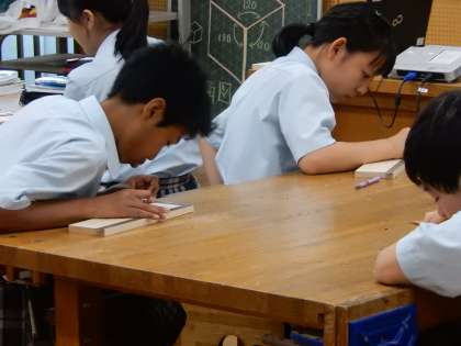 1年生の技術です。さしがねを使ってけがきを行っていました。上手な使い方を先生が丁寧に説明してくれました。