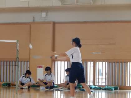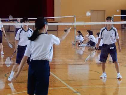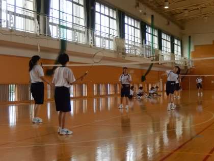 2年生女子の保体です。バドミントンを行っています。以前よりラリーが続くゲームが多くなりました。