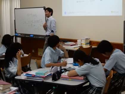 2年生の英語です。ALTのジョージ先生との会話テストを行ったり、テストに備えて原稿をまとめたりしています。堂々とスピーチする生徒には「エクセレント!」