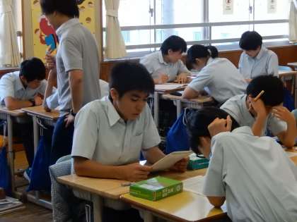 3年生の英語です。テスト返却後、ペアでテスト直しをしています。
