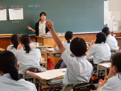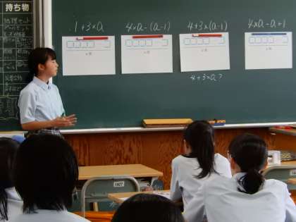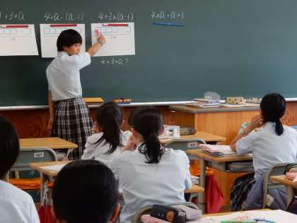 1年生の数学です。ストローを使った課題に、自分なりの解き方を見つけた人が発表しています。いろいろな考えが出ていました。
