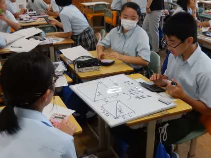 3年生の数学です。平方根の活用の学習です。身近な所に存在する平方根をグループで探しています。