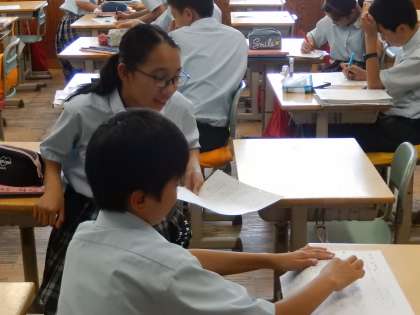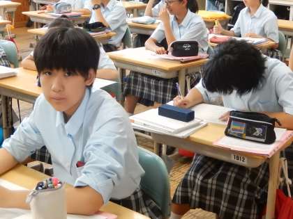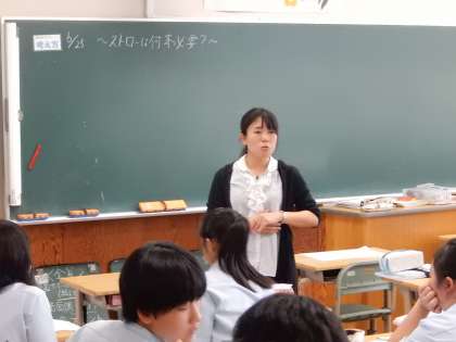 1年生の数学です。ストローの本数を考える問題です。考えがまとまると、仲間と交換し合いました。