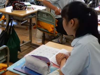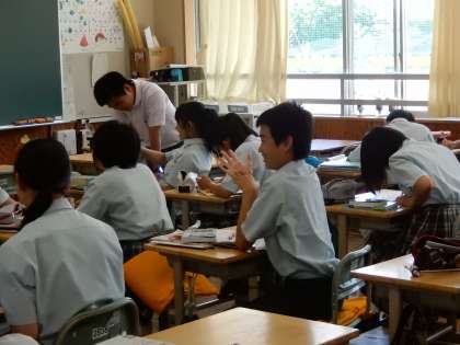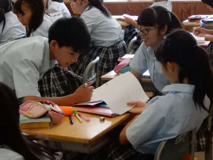 2年生の英語演習です。こちらは楽しそうな雰囲気で問題を解いたり、先生に質問したり、仲間と答え合わせをしたりして英語の学習を進めていました。