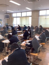 3年生の英語です。リスニングテストの後、問題演習を行っていました。辞書で調べたり、教科書を読み返したりしながら、正しい答えを確認していました。