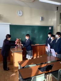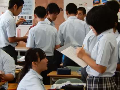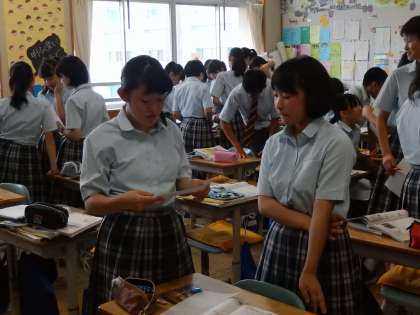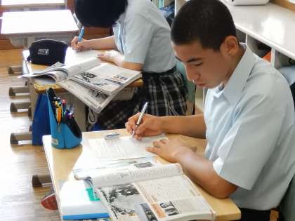3年生の社会です。太平洋戦争の学習が進んでいます。個人でまとめたレポートの内容を、仲間に説明し合っています。