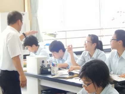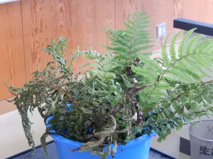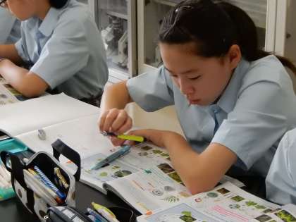 1年生の理科です。シダ植物について教科書を読み、ノートにまとめています。この後、観察が待っています。