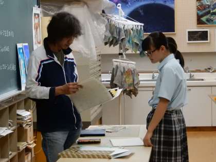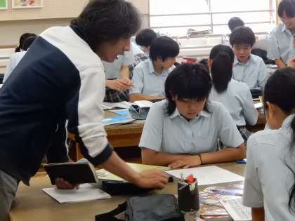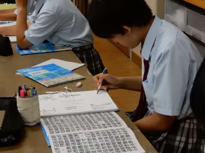1年生の美術です。絵文字の作製に励んでいます。先生のアドバイスを真剣に聞く様子が印象的です。