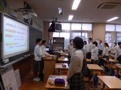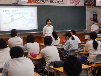 後期の保健カウンセリング委員がプロジェクタを用いて、クラスメイトに説明しました。3年生の様子です。