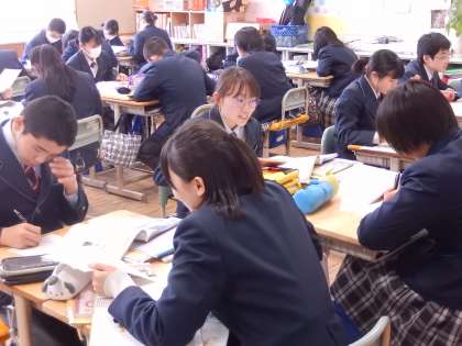 3年生の社会です。ペアに課題の説明をする制限時間ギリギリに教室に入りました。ピッタリに終わった生徒は万歳です。