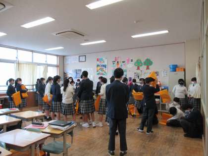 A組は防災頭巾を使って何かをしていますね。何をしているかは仕上がりまで内緒にしておきましょう。