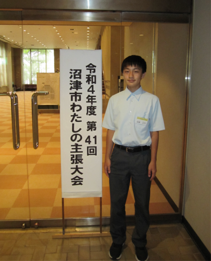 6月11日、沼津市民文化センター小ホールで「わたしの主張沼津大会」が開催されました。中等部からは3年の遠藤才門さんが代表として出場しました。遠藤さんは「常識について考える」という題材で、落ち着いて堂々とした発表をしました。