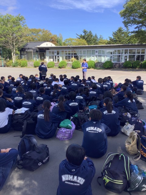 10月8日(水)今日、明日、2年生は高原教室です。出発式を終えてこれからバスに乗...
