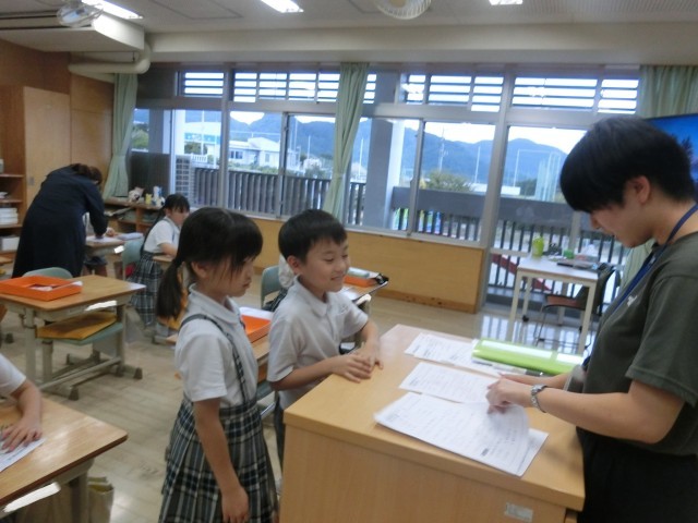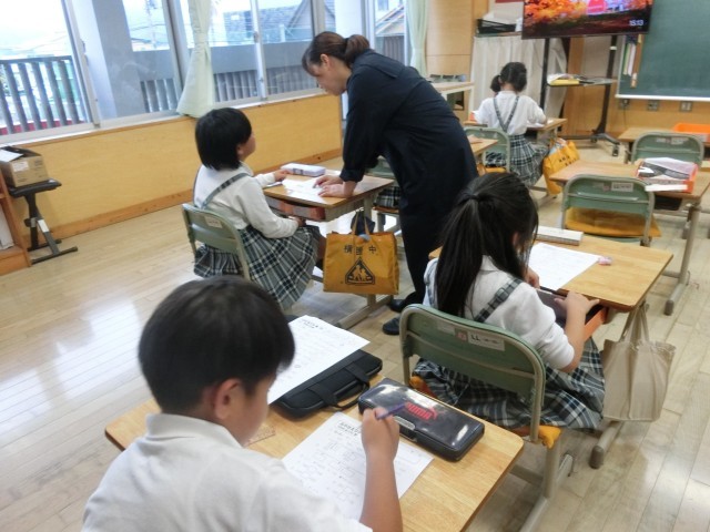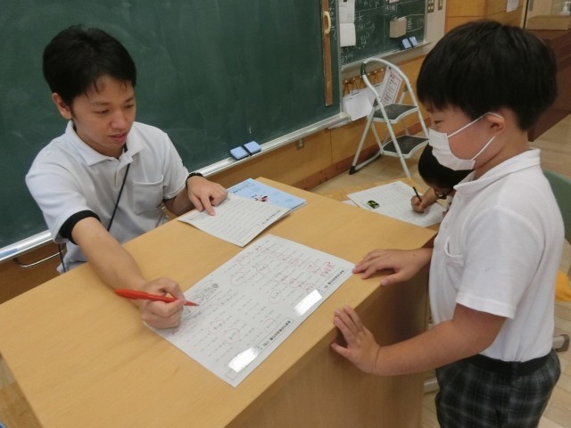 本日、「黒潮塾・とびうお塾」を行いました。算数の学習内容の中で、子供たちが少し難しいと感じているところを中心に、プリントで復習を行いました。子供たちの質問に、支援員の方が丁寧に教えてくださっています。