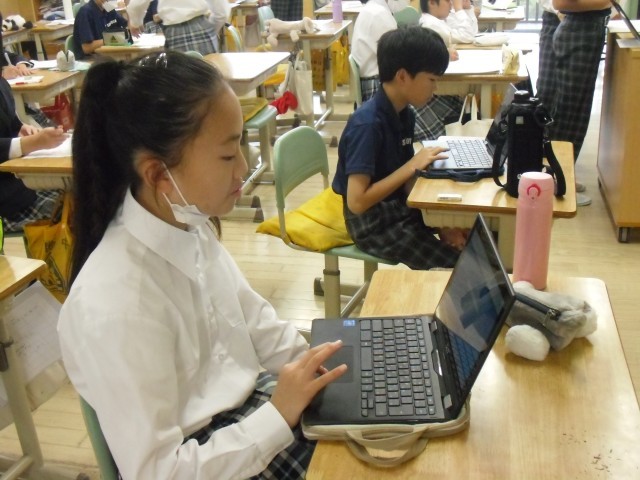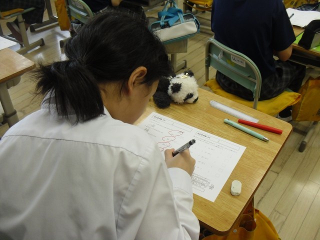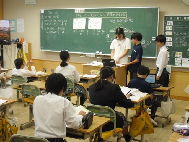 6Aの算数では、比の学習をしています。今日は、等しい比の関係について考えを発表し合い、まとめた後、問題練習に取り組みました。