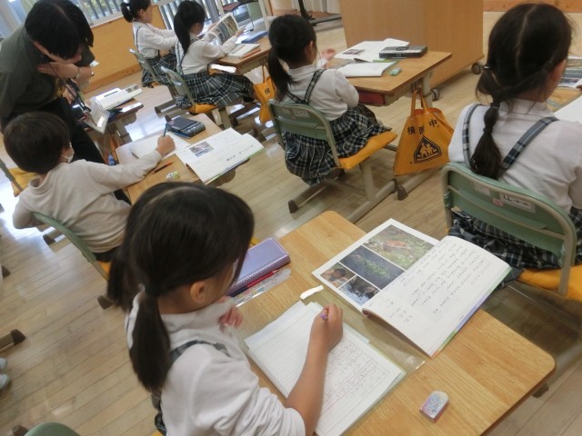 2Aの国語では、「ビーバーの大工事」の学習をしていました。学習問題について、教科書をしっかりと読みながら、ノートにまとめていました。