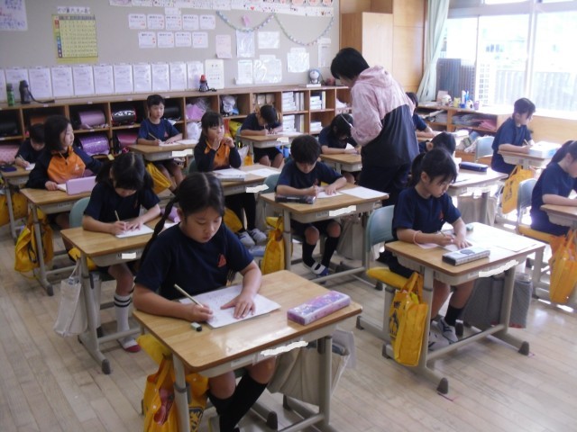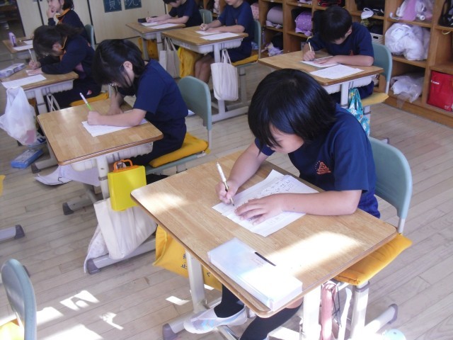2年生は硬筆です。2Aの子供たちは、お手本をよく見て書いていました。